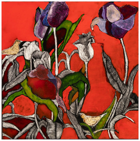 Acrylic Paint Gold Leaf and Etching on Mounted Scratchboard 8x8"