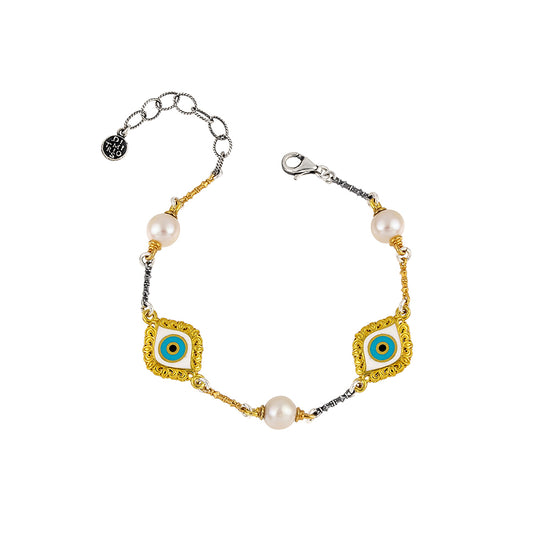 Its central element consists of two impressive eye-shaped components, framed by an ornate gold-plated setting and adorned with the characteristic blue of the evil eye. Its secure clasp and chain extender ensure a perfect fit for various wrist sizes.