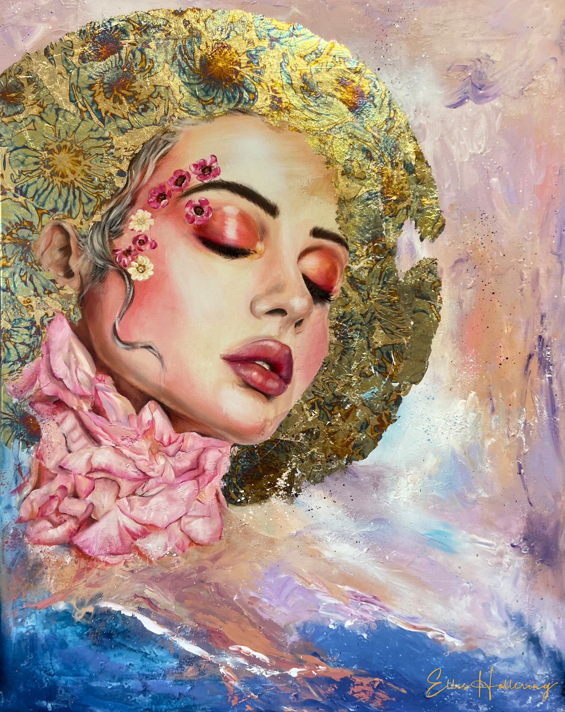 With "Burgeoning Bloom" I invite you to think about your inner strength, but also that of all other women. The delicate petals, golden shimmer and bold brushstrokes serve as a reminder of your own potential, waiting to blossom in the warmth of life.