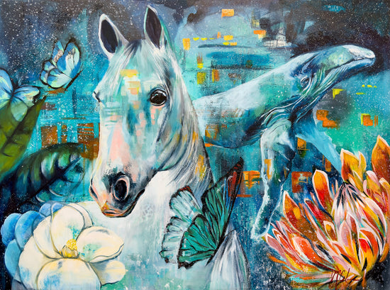 Watching over each other and us, the magical creatures in our world work together in Enduring Love. Enduring captures the land sea and sky, a theme that seems to travel throughout many of my paintings. The connection between nature and human existence and how we can all take care of each other fascinates me and prevails throughout my artistic voice.