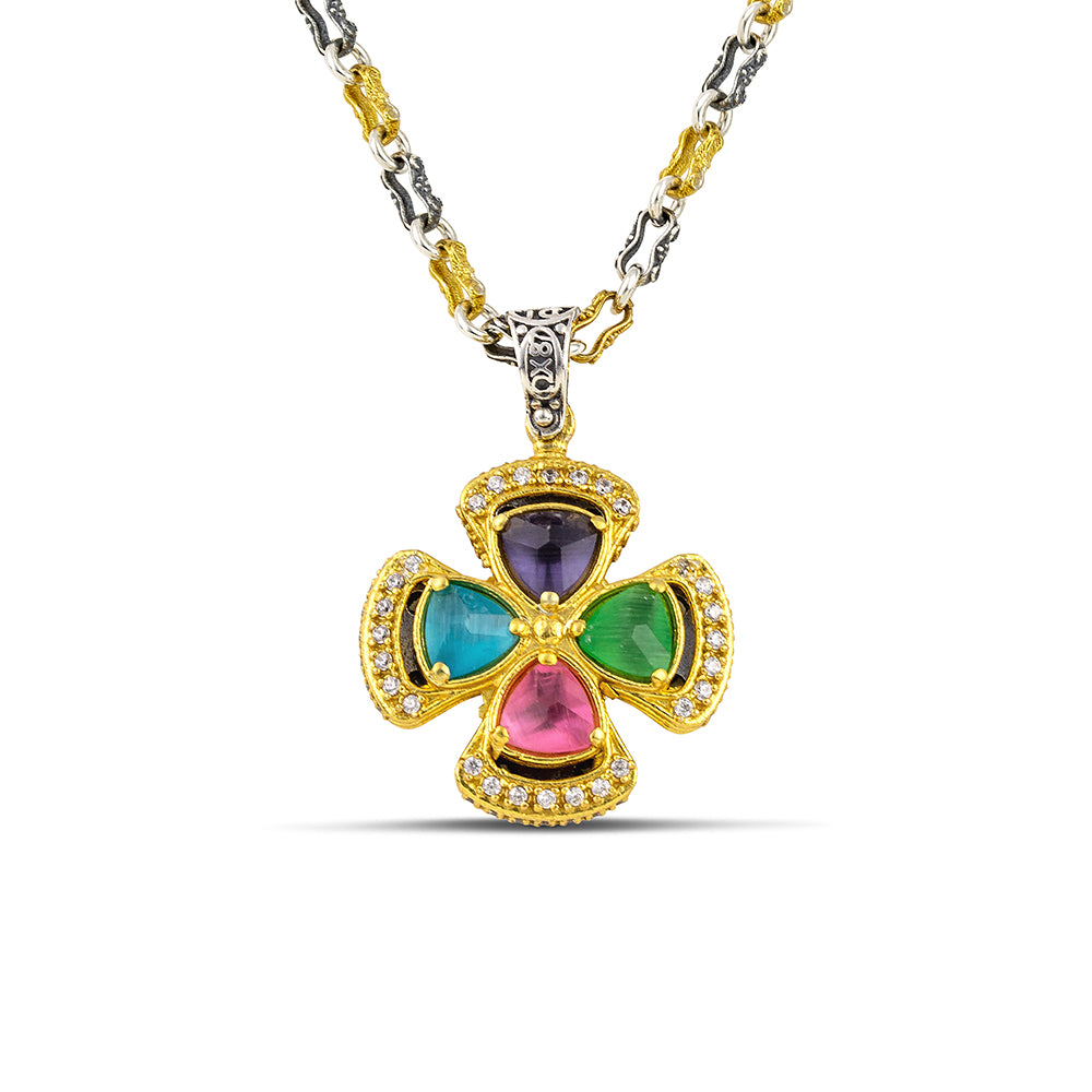 The stones are meticulously set in gold plated sterling silver bezels, adding a touch of opulence and enhancing the necklace's overall elegance. To further accentuate the pendant's charm, an array of small zircon stones are added to the bezels, reflecting light with every movement. This brilliant sparkle adds an extra dimension of glamour and sophistication.