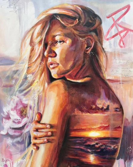 Rising Dawn is an oil mixed media painting featuring a woman, warm sunrise and peony flower, in an abstract realism style.