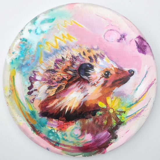 ‘Hidden Gem‘ a mixed media oil painting featuring a Hedgehog and 3D flowers painted in a warm colour palette with bright yellow, crimson and sienna in an abstract realism style. Created with 3D textures, iridescent powders and rich oil paint.