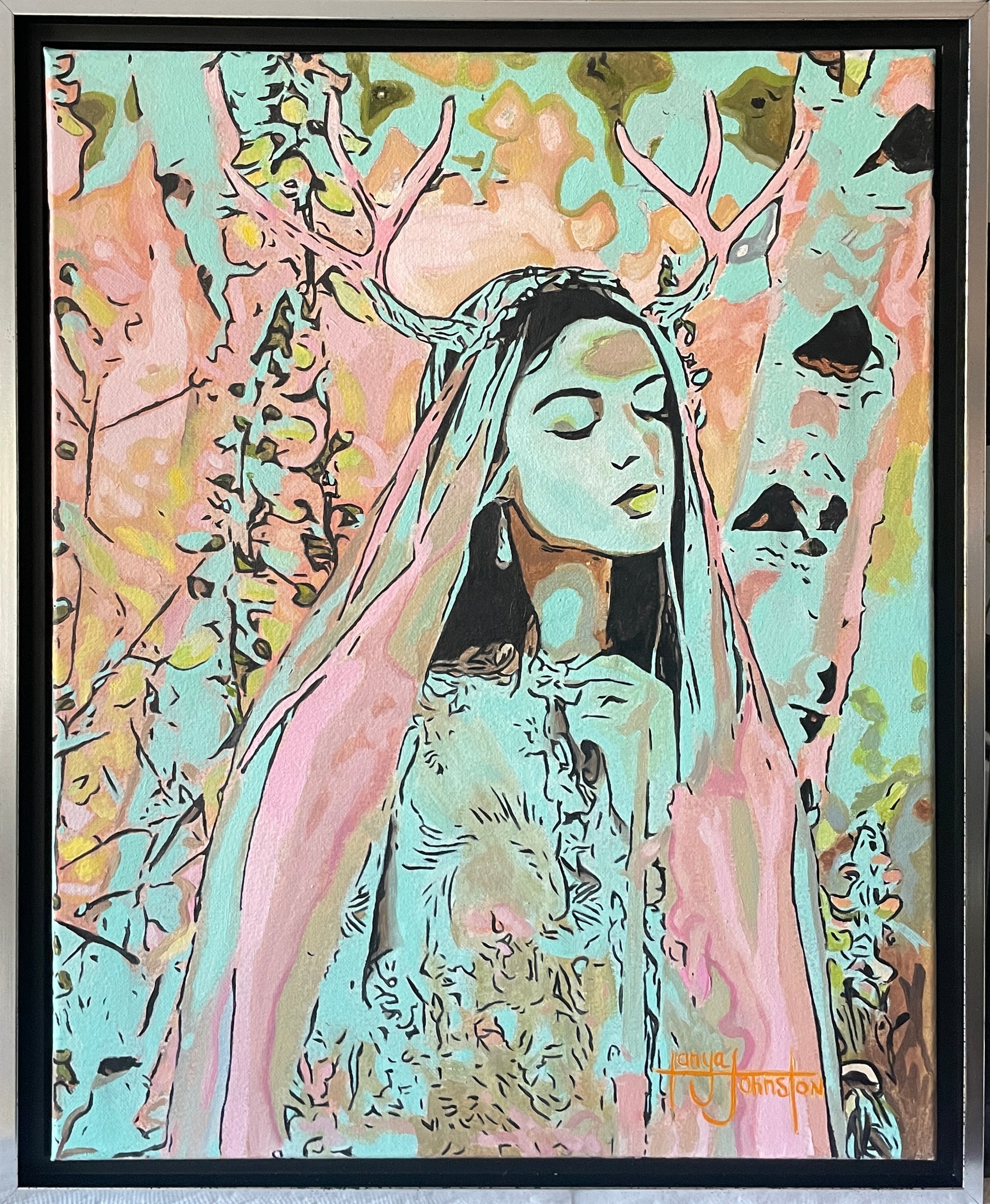 Now and then someone asks me “What does it mean, does it have a meaning?” yes!  My paintings have personal meaning. Funnily enough, added  layers of meaning come sporadically  as the painting materializes under my hand. Arriving  like whispers in the wind or feathers floating from above, they softly make themselves known,  as the painting progresses to completion. That being said, for me deer represent an innocent trust, a certain vulnerability, or surrender to the Divine, a softness of heart and soul. And flowers, well I can’t get enough of them, they are a language all their own that awaken the senses. Space here does not allow me to give account for what they represent to me but I adore them and paint them because I do.
