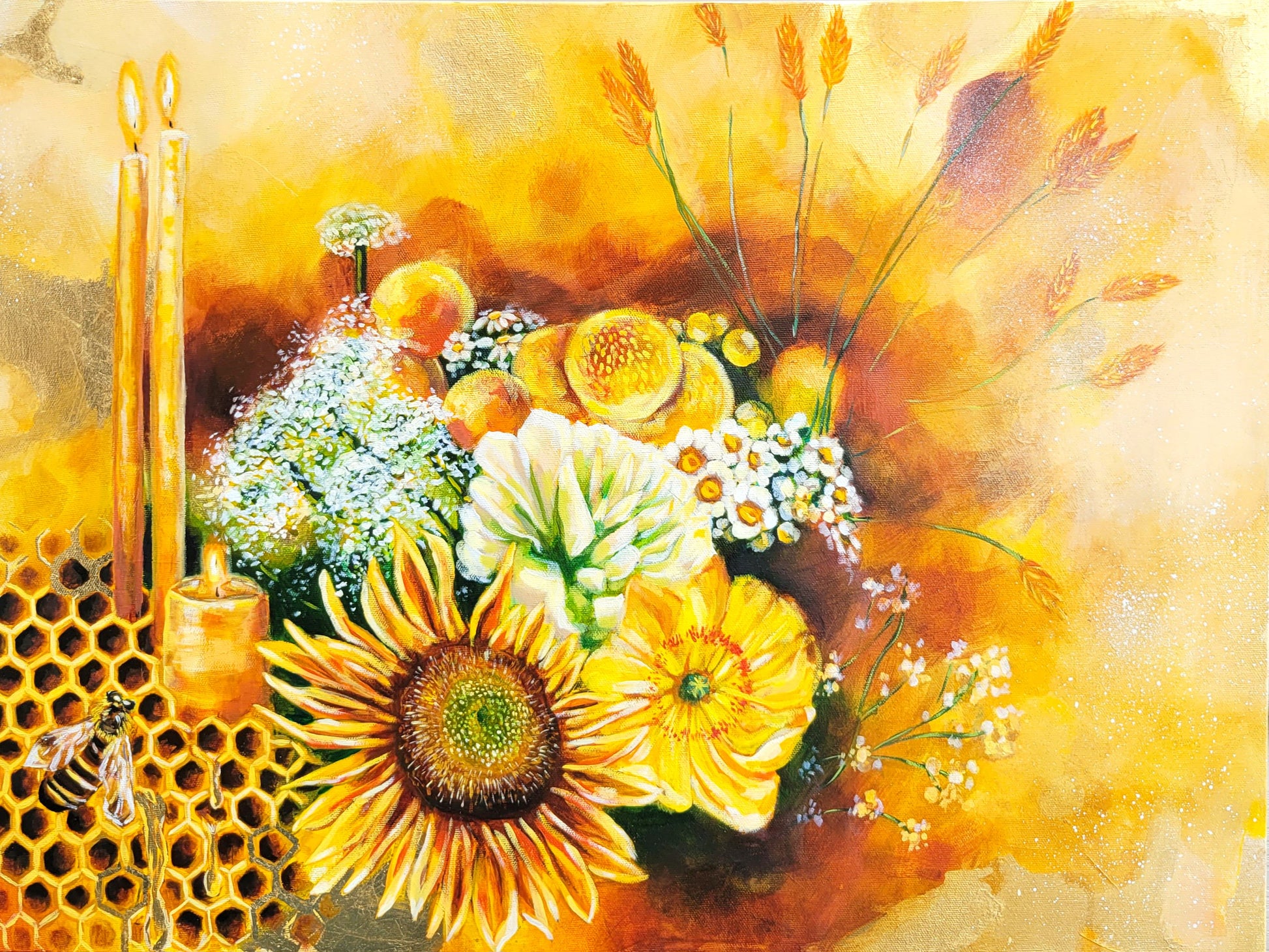 This painting was inspired by our deep dependence on nature and its eternal cycle of life. The growth of flowers requires light, just as bees are drawn to flowers, aiding in the production of honey and beeswax. Ultimately, this process allows us to create light through candles.