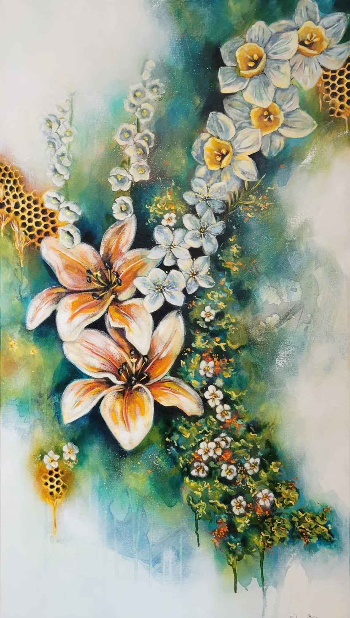 The soft, white parts of the canvas represents the hard parts of life, the difficulties, whether you are lost, lonely or sad, the flowers represent growth and hope and how beautiful life can be. It’s emerging just like a butterfly out of its cocoon.