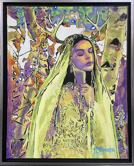 Now and then someone asks me “What does it mean, does it have a meaning?” yes!  My paintings have personal meaning. Funnily enough, added  layers of meaning come sporadically  as the painting materializes under my hand. Arriving  like whispers in the wind or feathers floating from above, they softly make themselves known,  as the painting progresses to completion. That being said, for me deer represent an innocent trust, a certain vulnerability, or surrender to the Divine, a softness of heart and soul. And flowers, well I can’t get enough of them, they are a language all their own that awaken the senses. Space here does not allow me to give account for what they represent to me but I adore them and paint them because I do.