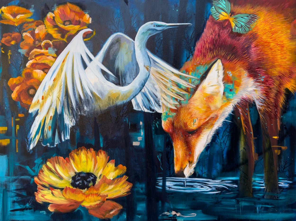 I love egrets. There are many of them where I live. For this piece, I was in the mood for a fairy tale. I wanted to feel a connection between two souls.