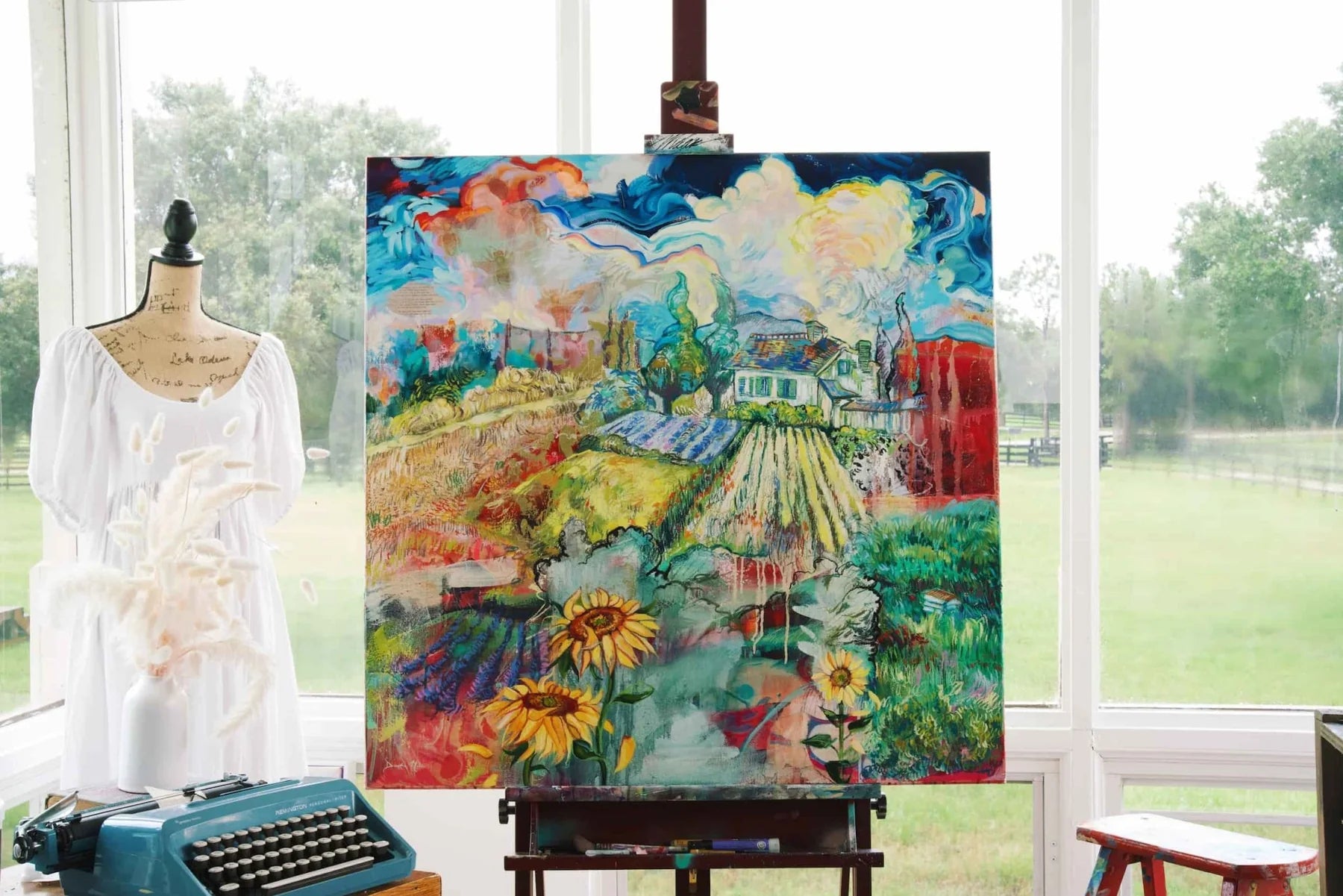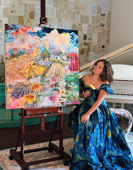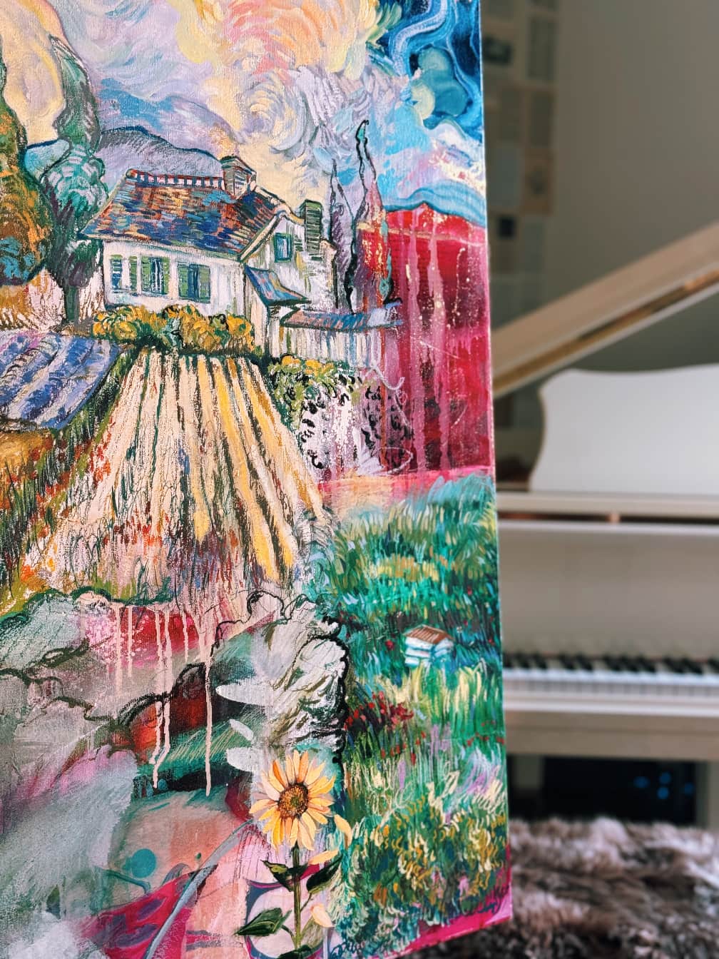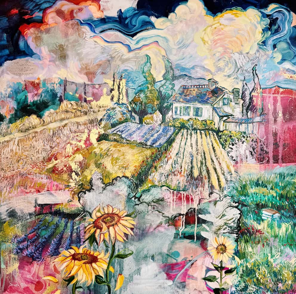 I had a dream that I was in Van Gogh’s studio, finishing one of his landscapes. I remember specifically the color yellow and creating golden swirls in the sky. This piece was birthed from that dream after being stuck and not working on it for two whole years….