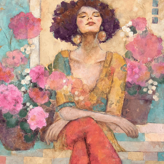 Seated among blooms that press close and spill into her lap, she has turned inward, face lifted to receive a light that is no longer outside her but within. She is the seed the sun has already found — not dormant, but quietly growing, absorbing warmth into something not yet named. The garden here is less a place than a condition: an atmosphere of slow, luminous becoming in which a woman and the growing world around her are simply the same thing, at different stages of bloom. This painting is inspired by my grandmother and her love of flowers, when I looked through my camera to photograph it, chills took over me as I saw her face and knew it had created a portrait of her from Heaven.