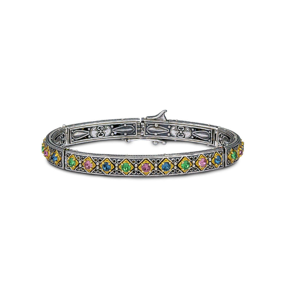 From the Hephaestus collection, a fine sterling silver bangle bracelet with round multi colour Swarovski crystals set in gold plated  ornate bezels.