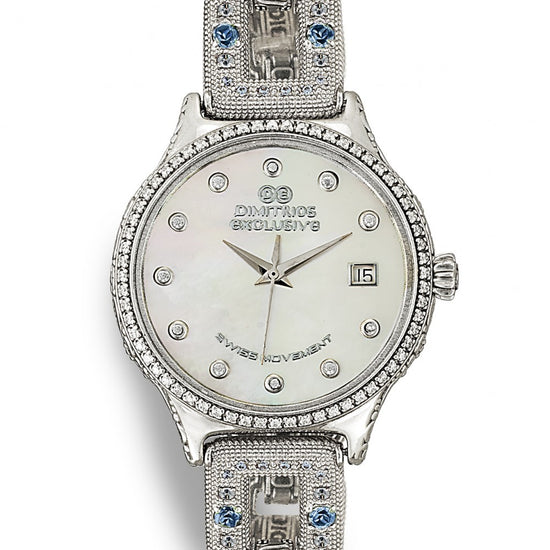 A stylish 36mm watch that will help you stand out.Made of silver with a dial made of mother of pearl ,it gives the shine that every woman deserves.It has a screw-down crown that ensures the watch is waterproof and a leather strap that adds elegance and luxury.The watch mechanism comes from the popular Swiss company ETA.A special jewel essential for every woman ready to adapt to all the challenges of everyday life.