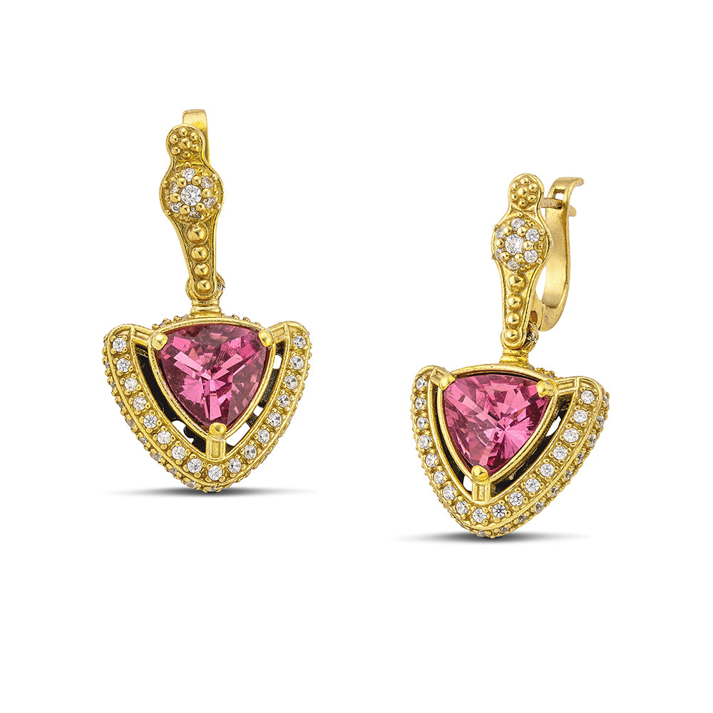 The focal point of these earrings is the mesmerizing large, inverted triangular cat eye gemstone. With its enchanting color, this gemstone adds a touch of mystique to your ensemble. The gemstone is securely set in a bezel made of gold-plated sterling silver, for a luxurious aesthetic.