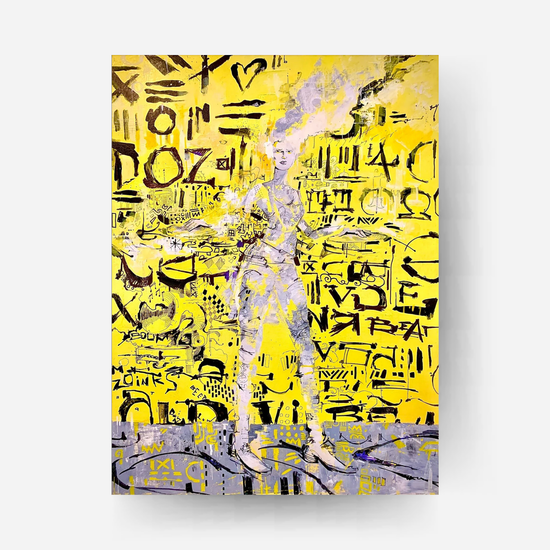 Abstract Figurative Painting, 30 x 40, graphite, Ink , Acrylic on heavy Canvas . # 1 in a  series of musical individuals proclaiming truth through positivity, honesty, love and tranquility.A proclamation with urban hieroglyphics street poets background. The use of gold and grays are meant to stir the imagination as a scientific , limited palette experiment, in joy & jazz transfusion.