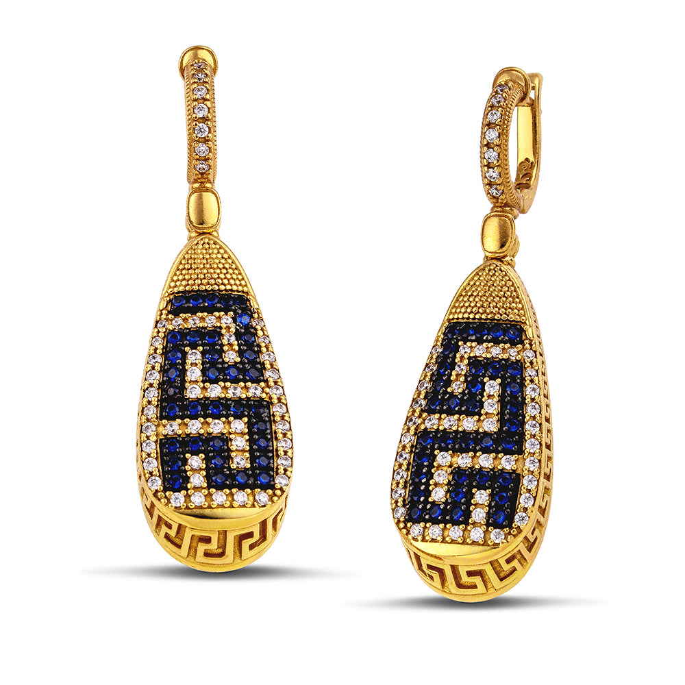 The dominant shape of the earrings, reminiscent of a teardrop or "drop," is adorned with the emblematic motif of the Greek meander. This ancient symbol, representing eternity, unity, and the infinite journey, is formed by sparkling blue and white cubic zirconia (CZ). The combination of deep blue with pure white creates a dazzling contrast that captivates the eye.
