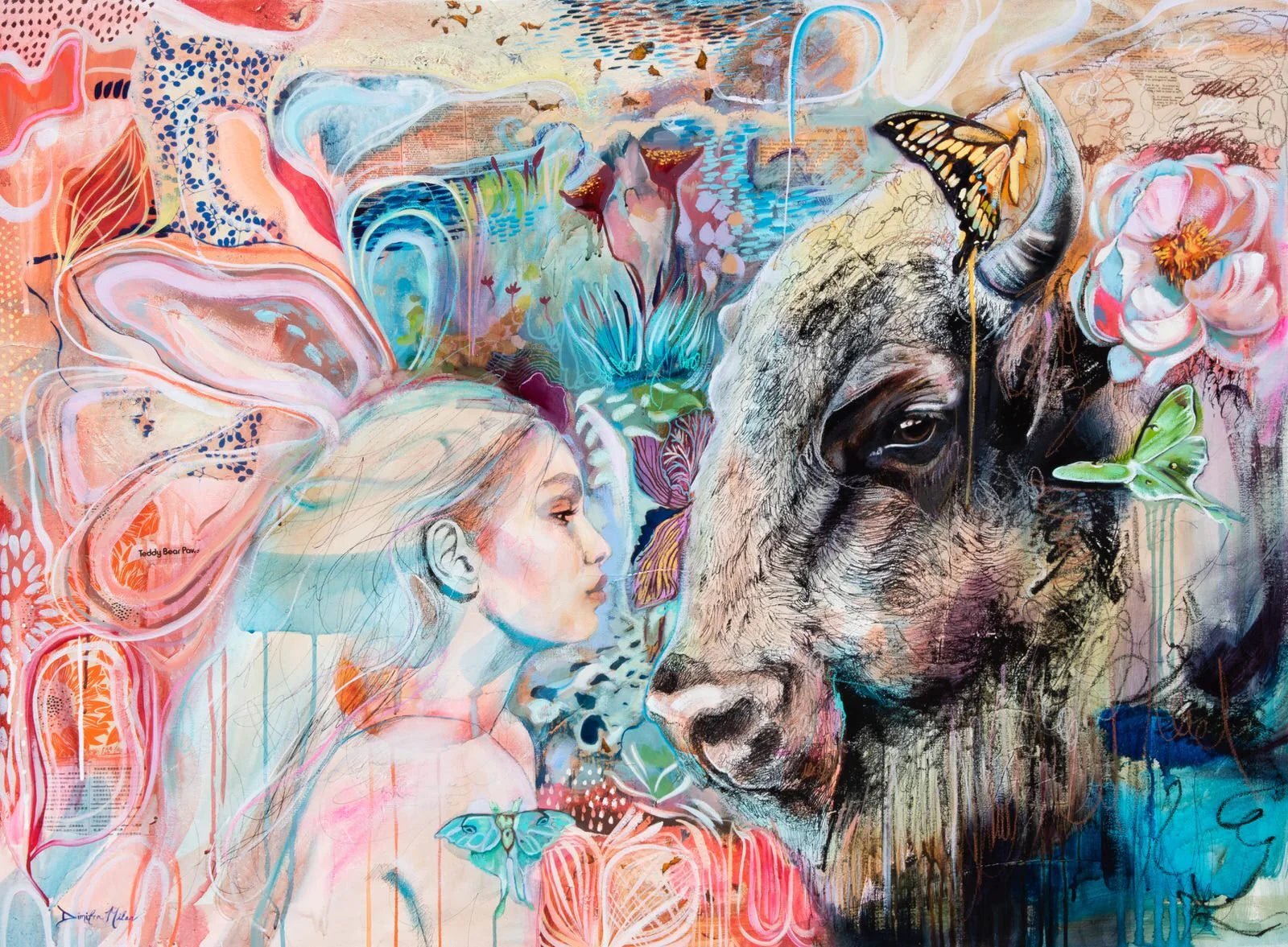 In this painting there are several layers of collaged papers and patterns. The woman and the buffalo were drawn with black ink and then finished with a few layers of oil paint.