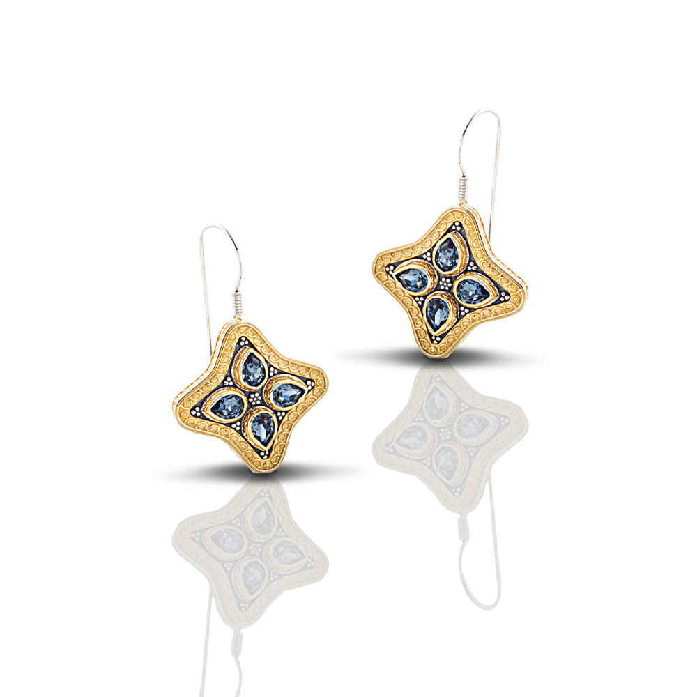 Influenced by the Byzantine era, Dimitrios Exclusive created the specific flower shaped earrings with the four Swarovski crystals in the center and around a gold plated embossed border.