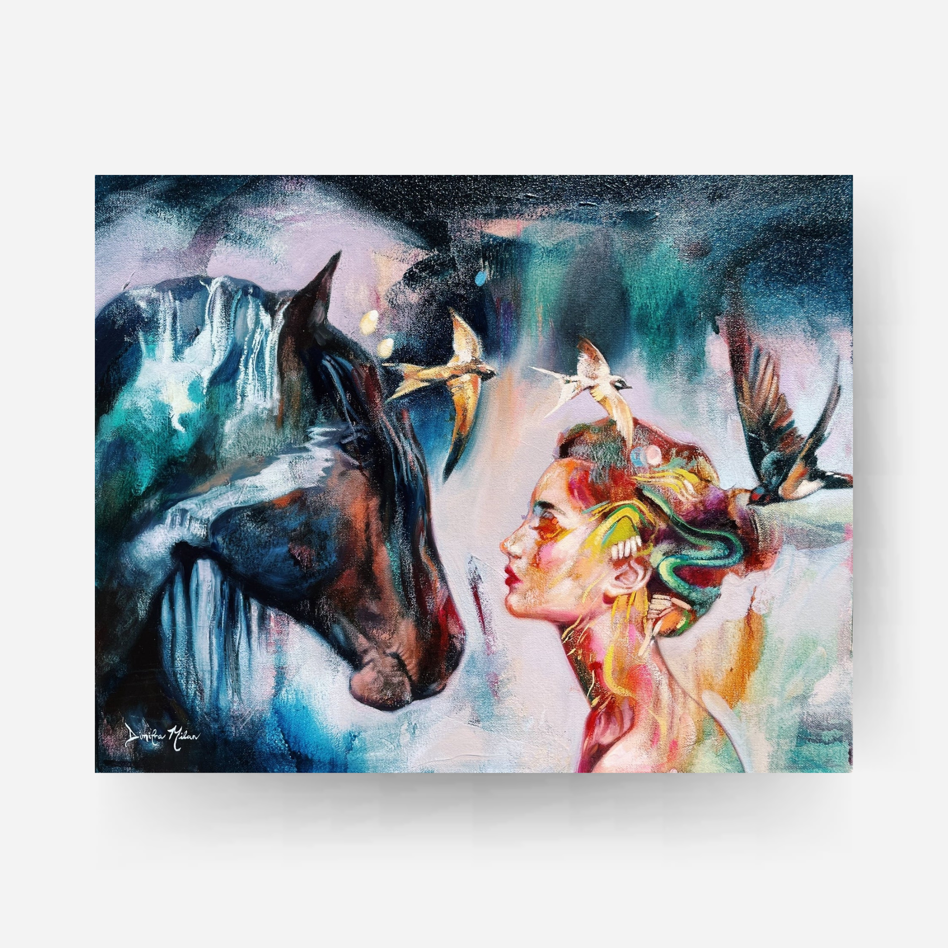 This was the first piece I completed after giving birth to my son. I felt inspired to paint two worlds coming together, the spirit realm and our lovely earth. It's a small glimpse into heaven and what that might feel like...